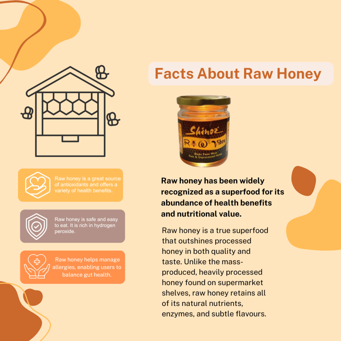 Raw honey is a true superfood that outshines processed honey in both quality and taste. Unlike the mass-produced, heavily processed honey found on supermarket shelves, raw honey retains all of its natural nutrients, enzymes, and subtle flavours.